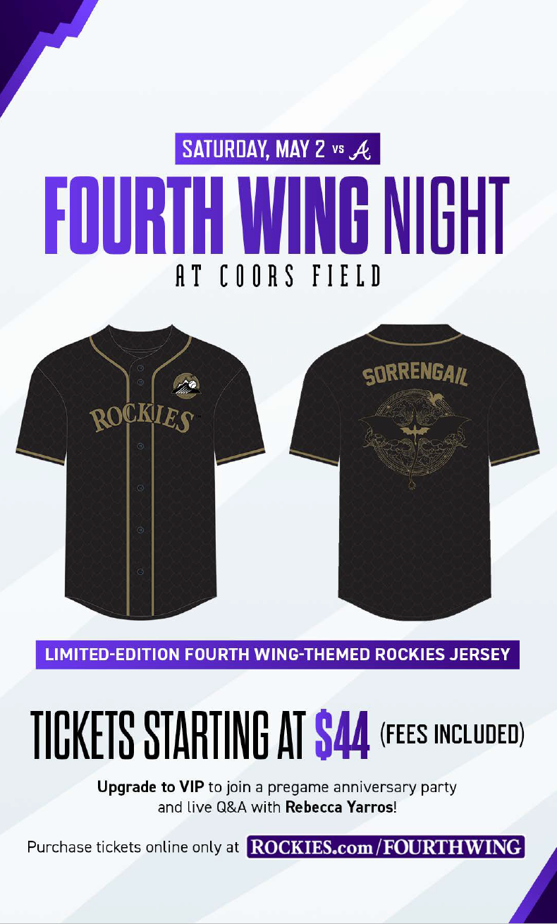 Fourth Wing Night at Coors Field in Denver, CO is on May 2! You can click the link below to see more about the event and what the ticket packages include!